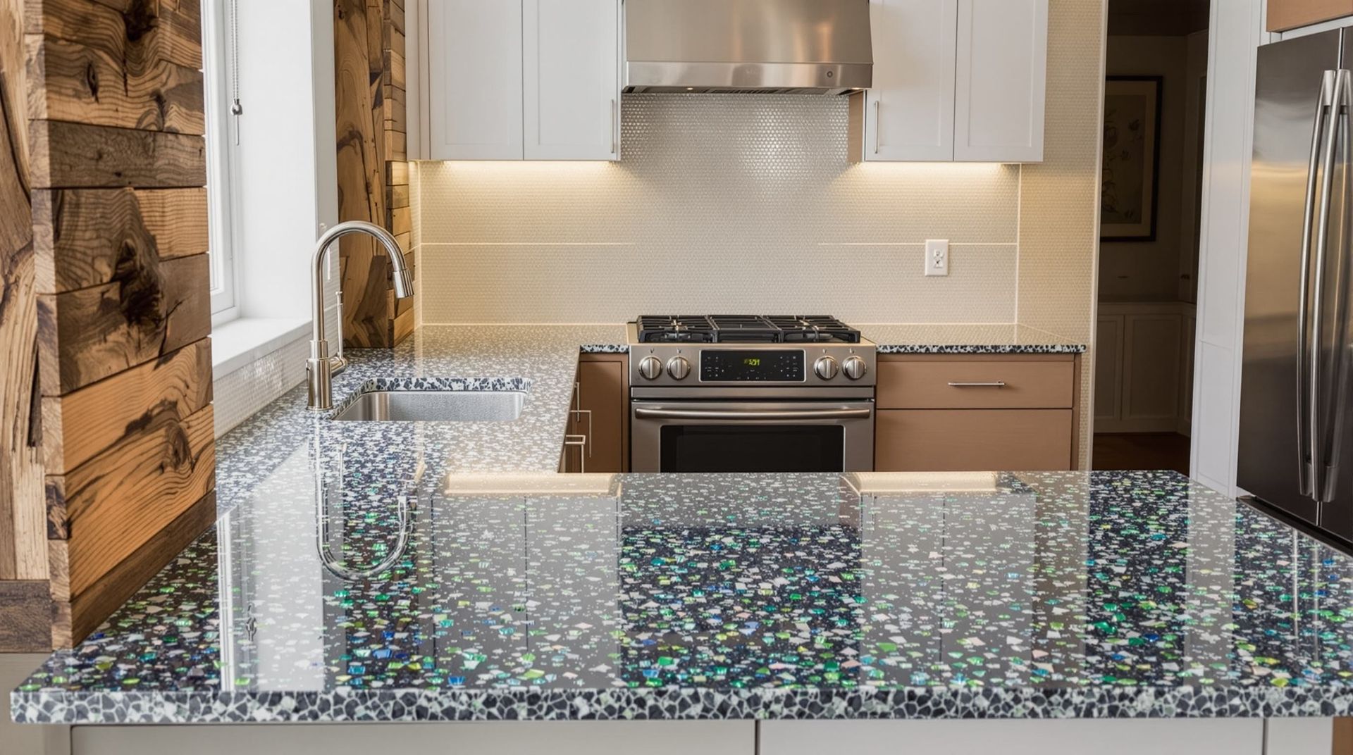 Recycled glass countertops feature crushed glass set into a durable base. The result is a surface with subtle sparkle and individuality. It fits especially well in St. Charles homes where homeowners want something distinctive without being too trendy.